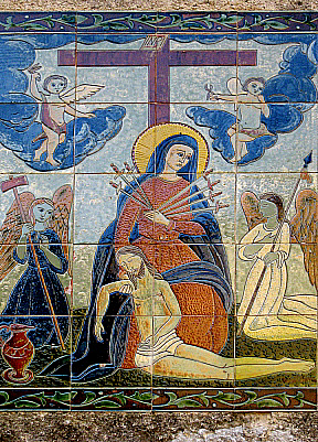 Rajoles a l'exterior l'església, damunt una font.