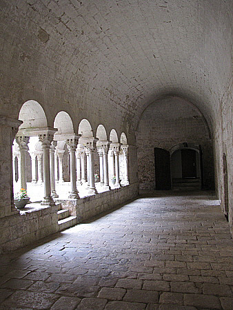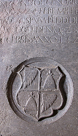 El claustre del monestir de Sant Daniel. Làpida sepulcral amb decoració heràldica.