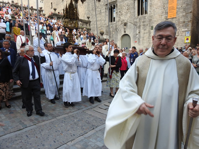 Al llarg de la jornada, desenes de voluntaris de la dotzena de confraries que conformen la Junta de Confraries van engalanar els carrers del Barri Vell amb les catifes amb decoracions florals, com a preludi de la missa solemne que es va dur a terme a la Catedral, acabada la qual l'Àliga va fer el ball d'honor, i seguidament s'inicià la processó, que va desfilar fins a la Basílica de Sant Feliu.