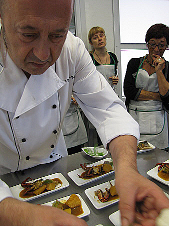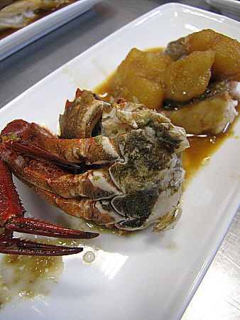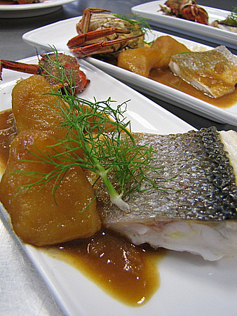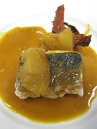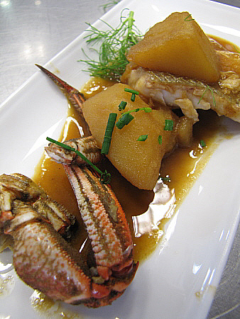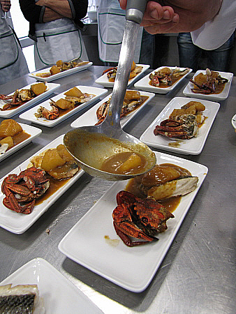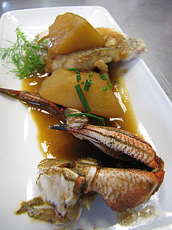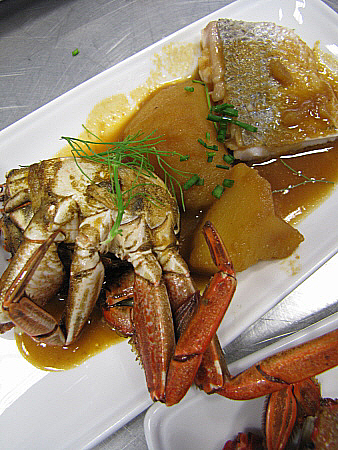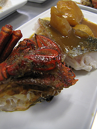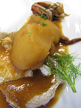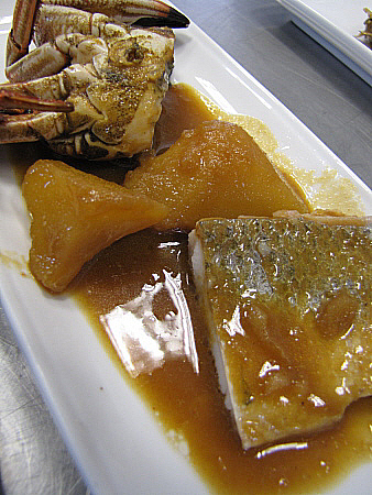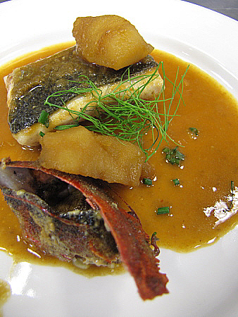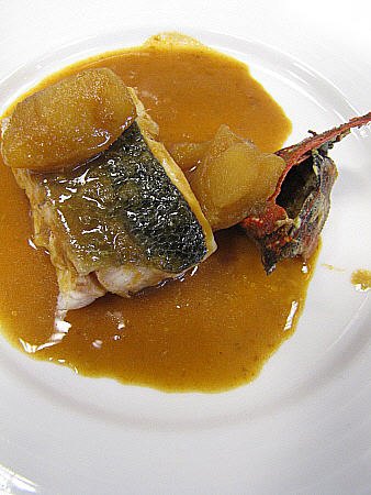 Suquet lleuger de fonoll i nècora amb llobarro al forn
