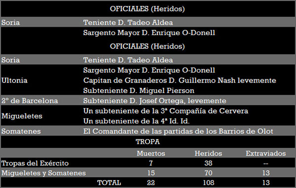 "Nota. En los heridos estan comprendidos el Sargento 1º Josef Barroso, y el 2º, Salvador Alfonso, ambos del Regimiento de Soria, que lo han sido en dicha accion, aunque levemente.