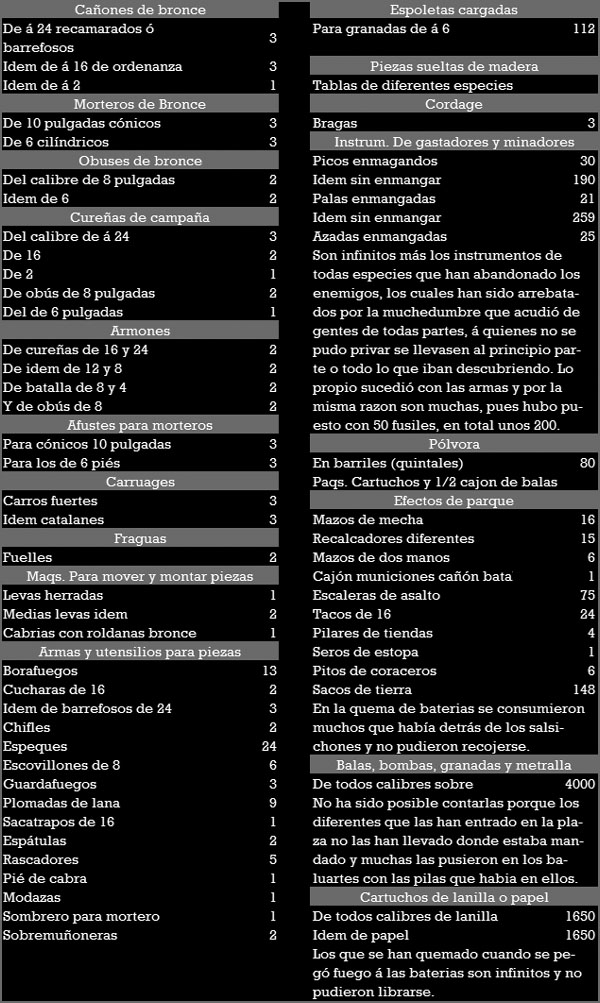 "En esta relación no ha podido incluirse muchas cosas y en particular los juegos de armas y demás que tenían en las baterías que se les tomaron, pues fueron conducidos inmediatamente al castillo de Montjuich, en donde se han confundido con los que por dotacion existiran allí además.