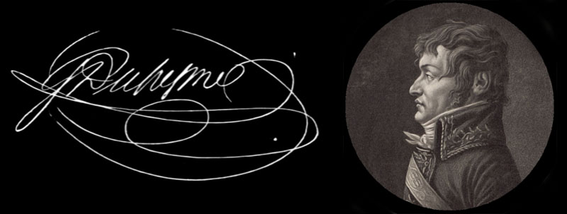 La junta desde el día del ataque del general Duhesme, estuvo animada del deseo de que con toda solemnidad y pompa se nombrase á San Narciso, generalisimo de mar y tierra, por considerar que con su protección se había alcanzado la victoria. Vencidas después todas las dificultades, se celebró una gran reunión de las personas más notables que había en Gerona para acordar y estender dicho nombramiento, lo cual tuvo lugar el día 1º de julio, conforme es de ver en el decreto que copiado del original obrante en el archivo de nuestro municipio transcribimos a continuación (1). Signatura i retrat del general Guillaume-Philibert Duhesme (1766-1815). Imatges font de Viquipèdia. Gravat de Charles-François-Gabriel Le Vachez.