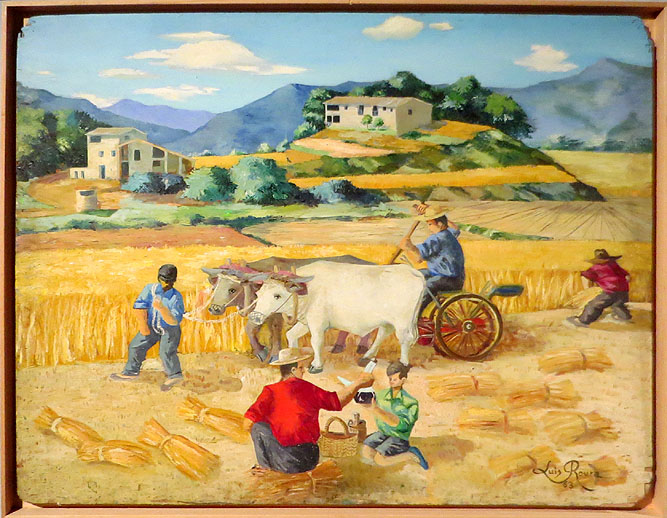 - Segant el camp nou. 1963. El pare de Roura tiba del parell de bous i el seu germà Miquel fa anar el rampí per deixar les garbes a punt de lligar, mentre un nen passa el porró. 89 x 116.
