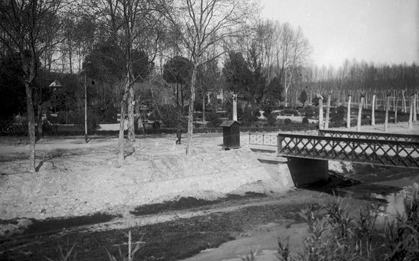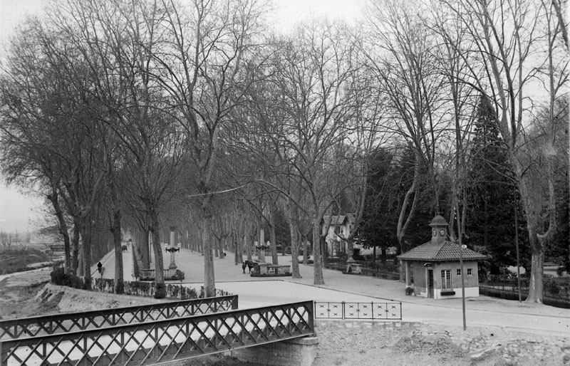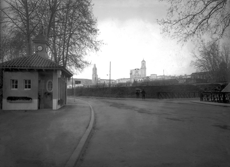 Passeig de la Devesa amb la Caseta del Rellotge, a l'esquerra, i el pont homònim, a la dreta. 1926. Autor desconegut. INSPAI - Diputació de Girona - (Ampliar)