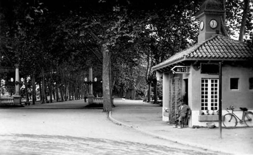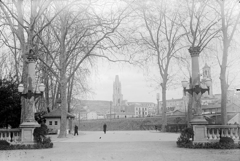 (Ampliar) - Entrada al Parc de la Devesa. A l'esquerra, la Caseta del Rellotge. 1930-1940. Valentí Fargnoli i Annetta. INSPAI - Diputació de Girona
