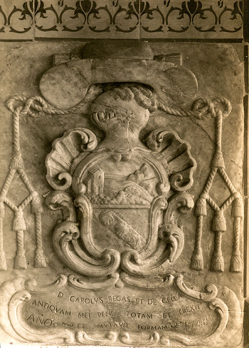 (Ampliar) - Escut de Carles Regàs i de Cella, 1748. Pati interior de l'antiga Casa de la Caritat, posteriorment Centre d'Acolliment i Serveis Socials de la Sopa, al carrer Claveria. 1919. Valentí Fargnoli i Annetta. CRDI - Ajuntament de Girona.