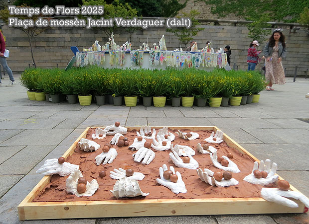 A la plaça de mossèn Jacint Verdaguer (dalt) es va instal·lar el muntatge "Tots amb la dana". Tota ciutat, tot poble és inundable. Només pel fet de viure ens podem ofegar amb aigua, amb fang. I és aleshores quan les persones actuem i demostrem ser solidàries. Cal, però, ser sotmesos a una inundació perquè surti la nostra part humana? Representem amb la dana la solidaritat i convidem a reflexionar sobre la condició efímera de la vida… Sempre amb esperança. Elaborat per l'alumnat de les optatives d'Ed. Plàstica, Visual i Audiovisual de 3r i 4t d’ESO i L’Hort de 4t d’ESO. Professorat: Imma de Batlle, Patrícia López, Sílvia Franch i Jordi Coll.