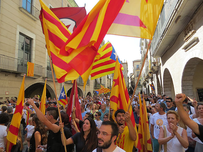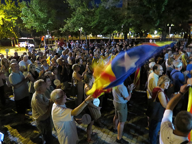 11 de setembre. Concentració prèvia a la manifestació a Salt, amb lectura del manifest i cant de Els Segadors a la plaça del Vi. Reportatge fotogràfic. 60 imatges. |