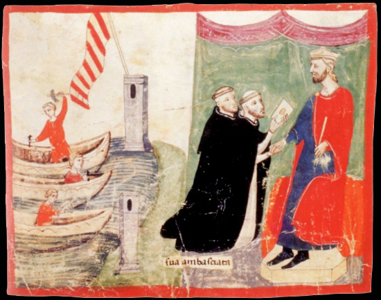 Nuova cronica. Biblioteca Apostòlica Vaticana. Preparatius de Pere III d'Aragó per anar cap a Sicília. El rei rep la visita de dos frares dominics enviats pel papa Martí IV. (Viquipèdia)