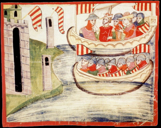 Nuova cronica. Viatge de Pere III d'Aragó envers Sicília. Segle XIV. Biblioteca Apostòlica Vaticana. Guerra de Sicília (1282-1289): desembarcament de Pere el Gran a Trapani; s'identifica al rei per la corona. (Viquipèdia)