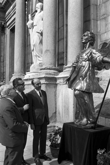 (Ampliar) - Acte oficial amb motiu de la col·locació de l'àngel nou al campanar de la Catedral. Entre els assistents a l'acte Mn. Taberner, l'alcalde Josep Bonet, el governador civil Víctor Hellín Sol, el bisbe Narcís Jubany i l'artista Ramon Carrera. 1968. Narcís Sans Prats. CRDI - Ajuntament de Girona