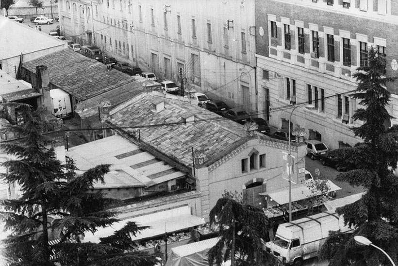 (Ampliar) - L'antic edifici dels Bombers i l'Escorxador Municipal, seu de les brigades municipals. 13 de febrer de 1988. Jordi S. Carrera. CRDI - Ajuntament de Girona.