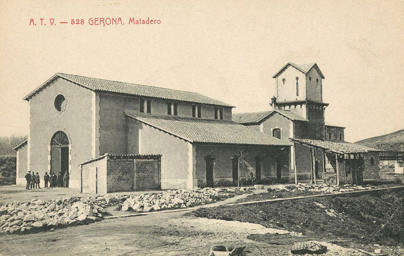 (Ampliar) - L'escorxador. Vista general de l’edifici de l’escorxador municipal, a l’avinguda de Ramon Folch. Al fons a la dreta, la muntanya de Montjuïc i el pont del Ferrocarril. 1905-1911. Autor desconegut. CRDI - Ajuntament de Girona. Amb anterioritat a la construcció, iniciada el 1894, de l'escorxador municipal de la ciutat, aquest equipament estava situat en l'actual carrer de Santa Clara, ben a prop del lloc on des del 1870 fins el 1944 es trobaven les Peixateries, a l'inici del pont de ferro. Relacionat amb aquest establiment, el dia 20 d'agost de l'any 1858, la corporació municipal prengué l'acord de distribuir en diversos espais públics del nucli urbà la venda dels productes alimentaris que s'havien d'oferir als possibles compradors, unificant criteris i espais habilitats.