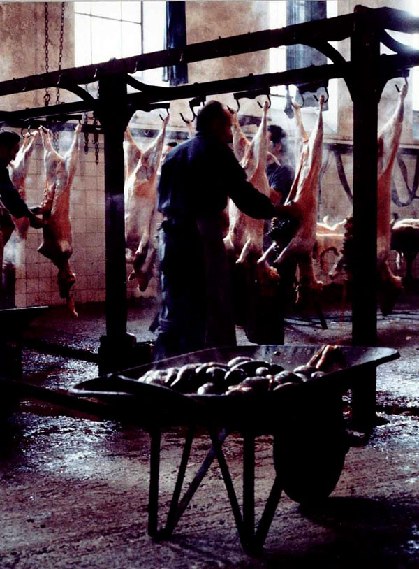 (1) - "Así pues una casa con dos cuadras, encerrándose en una de ellas los bueyes, las terneras y los cerdos, en la otra las reses lanares; luego una sala de matanza donde se sacrifican todas las reses escepto las de cerda; más allá un patio destinado a la vez a la matanza de los cerdos y a la limpia de los despojos de todas las reses; todo reducido, mal ordenado, con un manantial de agua que tan pronto lo inunda todo, tan pronto se queda en seco, con sus acueductos o regueras profundas, donde se detiene todo género de inmundicias, y particularmente desperdicios animales que millares de ratones arrastran al través de las grietas de las mismas regueras". Esmentat per Gemma Domènech Casadevall a "Patrimonis fràgils. Els escorxadors".