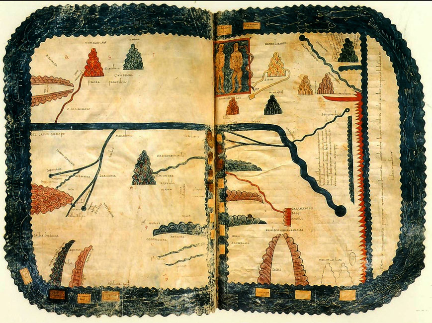 Una altra característica única d'aquest Beatus és que fuig de l'abstracció generalista i identifica clarament els personatges que hi apareixen: Ende hi fa constar el nom i el lloc on van predicar i els personifica amb fisonomies diferenciades. Aquesta diferenciació s'aprecia perfectament a la miniatura dels Apòstols. Més enllà de l'estil, el Beatus de Girona també és famós per la incorporacié de nous temes, com el cicle dedicat a la vida de Jesucrist, dins el que destaquen el Baptisme i la Crucifixió, o la representació del Paradís. Aquest conjunt de característiques fa que el Beatus de Girona sigui un dels manuscrits més interessants i influents de l'Alta Edat Mitjana. ![]() (Ampliar) - Beatus de Girona. Folis 54v-55r. Mapamundi. Viatges i facsímils