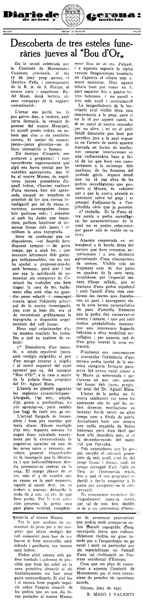 (Ampliar) - Article de Rafael Masó i Valentí sobre el descobriment d'esteles funeràries jueves al Bou d'Or. Publicat al "Diario de Gerona de avisos y notícias" de l'1/07/1931.