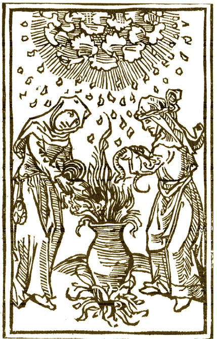 (Ampliar) - Preparació de filtres màgics. Gravat del segle XV. Publicat per Carles Vivó, op. cit.
