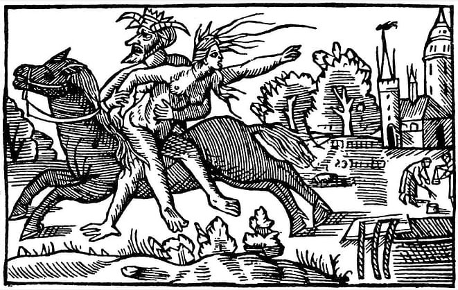 Bruixa arrossegada pel dimoni. Gravat del seg/e XVI. Publicat per Carles Vivó, op. cit.