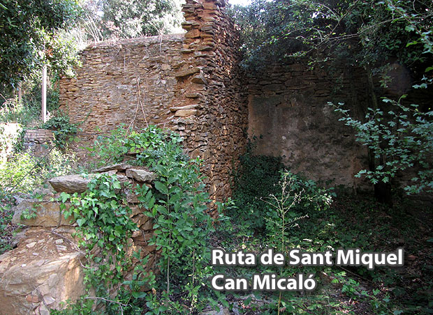 Seguint la ruta del castell de Sant Miquel, gairebé arribant al conjunt arquitectònic del castell, trobem les ruïnes de la masia de Can Micaló, exemple d'edificació amb la tradicional tècnica de la pedra seca. La pedra seca és una tècnica constructiva que té com a material bàsic la pedra, utilitzada sense cap més element d’unió, cosa que requereix una hàbil col·locació de petits elements que actuen com un de sol. És una tècnica molt habitual a tota la Mediterrània. Pels volts del castell de Sant Miquel i al llarg de l'itinerari es pot observar la presència de murs de pedra seca que delimitaven i consolidaven les feixes on es plantava antigament la vinya.