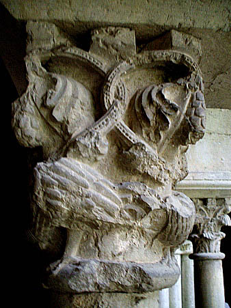 Capitell amb decoració de galls afrontats entre elements vegetals, consistents en fulles i tiges encintades i enroscades.