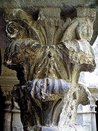 Capitell nº 46Capitell de tipus corinti amb decoració de temàtica vegetal, idèntica i continuada a les quatre cares. La composició es dissenya seguint dos ordres sobreposats de fulles d'acant, i un remat superior a les cantonades de volutes cargolades.