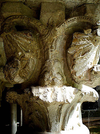 Capitell decorat amb elements vegetals consistents en conjunts de tiges, i fulles que sorgeixen del cap d'un animal fantàstic, invertit, repetint el disseny a cadascuna de les quatre cares.