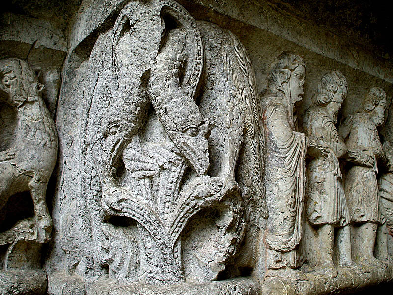 Capitell final del fris amb representació d'una parella de dracs entre elements vegetals, picotejant fruits. Bibliografia: