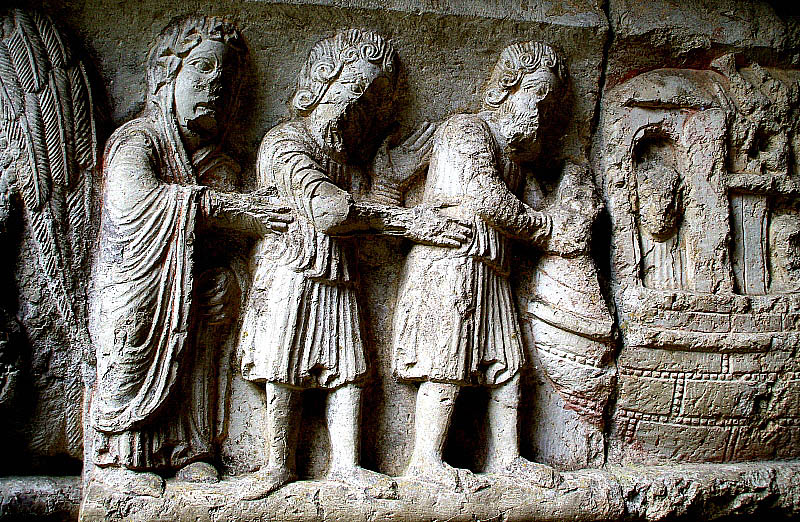 Esquerra: capitell final del fris anterior. Dreta: capitell inicial del fris, amb una escena de lluita d'un personatge que repenja els peus als lloms de sengles lleons que el flanquegen i li mosseguen les mans.