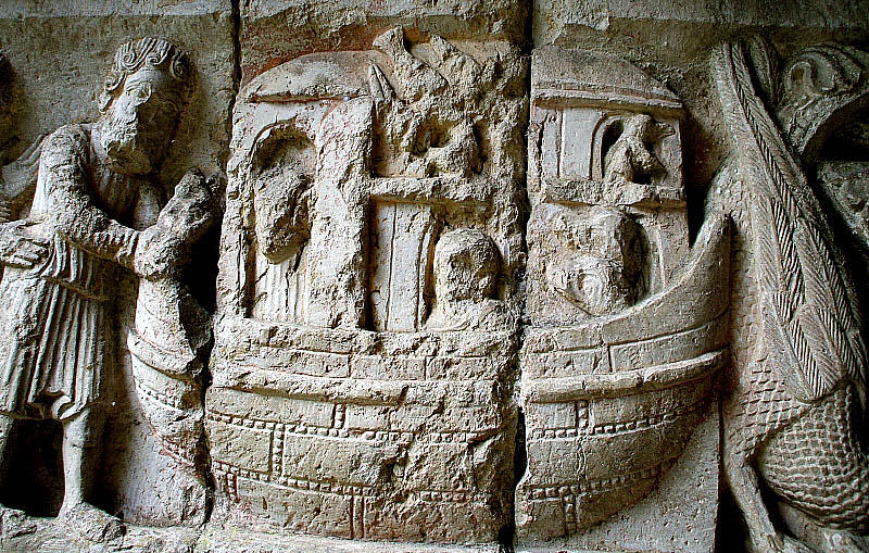 ![]() Pilar nº 9 (P9), Quart fris Pilar sud-occidental. En aquest fris s'hi representen, precedides de dos capitells, diverses escenes del Gènesi, continuació de la seqüència explicada en el fris anterior. Desenvolupa, en diverses composicions, l'embarcament a l'arca i la fi del diluvi amb l'arribada del colom.