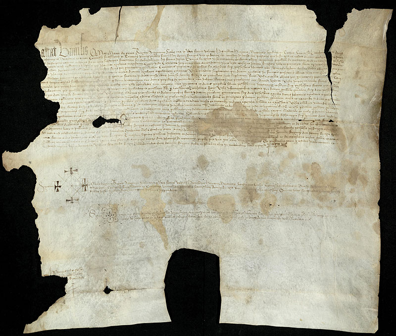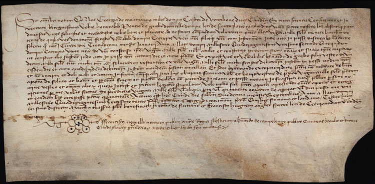 Al llarg del segle XV, la família passà per un seguit de vicissituds relacionades amb el patrimoni i amb un conflicte de tipus polític: durant la crisi successòria provocada per la mort sense descendència de Martí I l'Humà, el 1410, mentre que uns eren partidaris de les institucions catalanes, els altres optaren per la monarquia Trastàmara, la dinastia reial castellana. La Casa de Trastàmara va passar a regnar a la Corona d'Aragó mitjançant el Compromís de Casp, de 1412. ![]() (Ampliar) - 12 de setembre de 1433. Jordi de Caramany, cavaller, senyor del castell de Ventalló, confirma i reconeix que Ponç de Gurb, senyor del lloc de Sant Hilari Sacalm, sogre seu, li ha pagat 20.000 sous de moneda barcelonina, en concepte del dot atorgat a Caterina, filla del dit Ponç de Gurb, i esposa seva. Biblioteca de Catalunya.