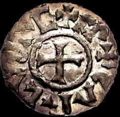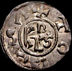 Diner de Carlemany (768-814). 21mm, 1.19 g. Tolosa de Llenguadoc. Anvers: +CLRLVS (S invertida) RE+ FR, creu. Revers: +TOLVSL (S horitzontal), monograma de Carlemany. (Wikipèdia).