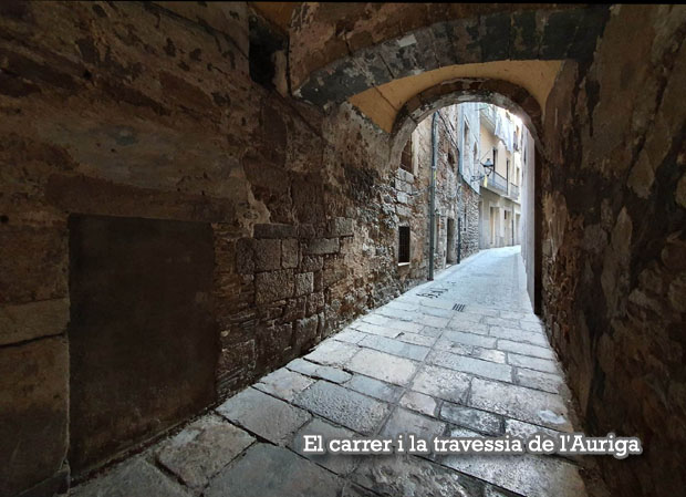 El carrer de l'Auriga comunica el carrer Nou del Teatre amb la pujada de la Mercè; el límit el fa la travessia de l'Auriga, perpendicular a aquest. El seu nom es documenta escrit de diverses formes: "carrer de n'Aurich", carrer "d'en Auriga", o "d'en Origa" (1716). També se'l conegué un temps per "carrer dels carnissers" (Alberch, op. cit). A la primera meitat del segle XIV s'anomenava carrer n'Aurich, la família propietària del casal del capdamunt del carrer. El 1535 ja s'anomenava carrer de l'Auriga, corrupció popular del nom originari, de n'Auric. La travessia de l'Auriga té una entrada pel carrer de l'Albereda, i seguiex amunt, deixant a l'esquerra el carrer de l'Auriga fins arribar, mitjançant unes escales, al carrer del Portal Nou.