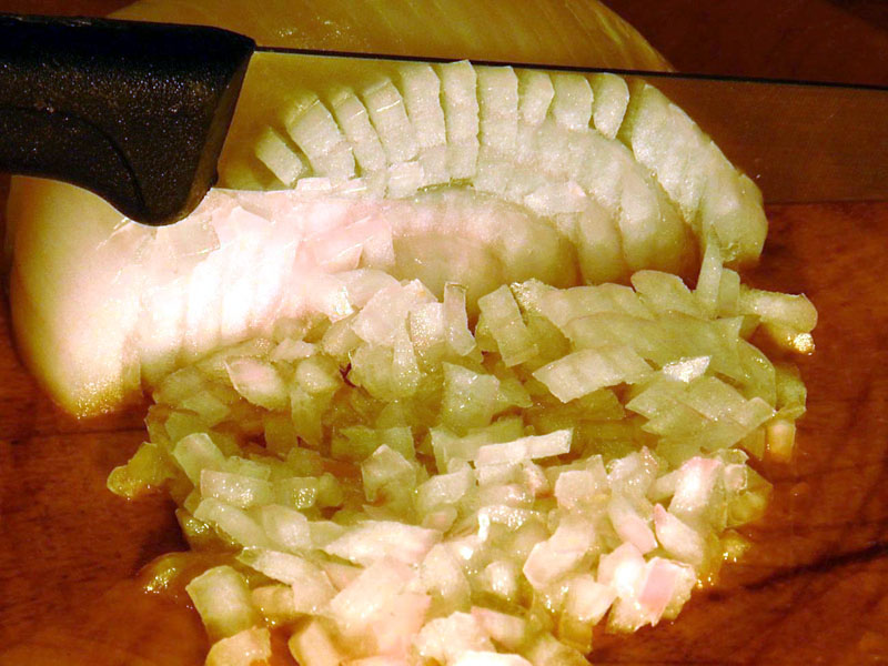 Per fer aquest sofregit cal que tallem la ceba a bocins molt petits, d’uns 3-4 mil·límetres (gairebé brunoise en termes d’hostaleria) (Foto). Cal tallar-la a ganivet, no amb un ratllador o un robot de cuina que ens causaria la pèrdua d’aigua de la ceba i no podríem sofregir llargament la ceba. Hi ha algun aparell manual amb fulles que roden o una mena de piconadores, també manuals, que s’aconsegueixen uns resultats força bons.