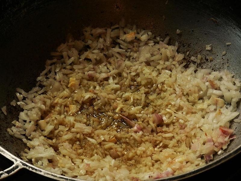 Un cop la ceba ben piconada l’afegirem a la cassola on hi haurà l’oli on hem fregit les carns i el peix. Si cal afegirem més oli. Començarem sofregint la ceba a foc fort en els cinc primers minuts i remenant-la. Afegirem sal per ajudar a fer "suar" la ceba. Anirem abaixant el foc i, de tant en tant, l’anem remenant per aconseguir que la ceba es vagi coent de manera uniforme. És una cocció lenta que va reduint i coent la ceba, que a poc a poc va perdent l’aigua. Sempre a foc suau (Foto).