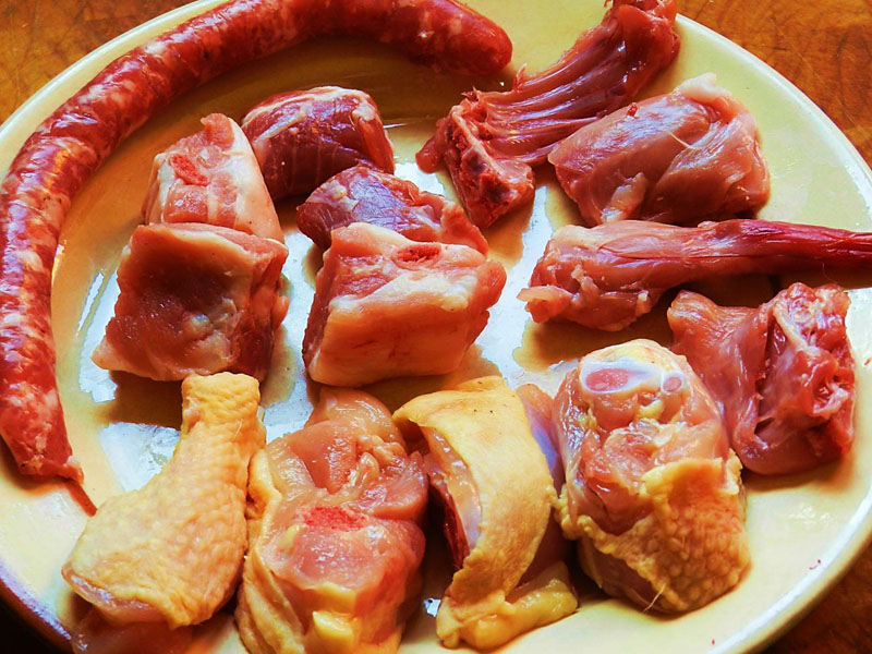 - 400 grs de carn tallada a trossos petits. Costelló de porc principalment, podeu incloure bocins de pollastre i conill, o salsitxes