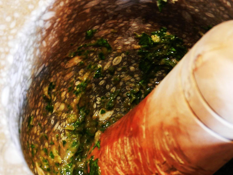Mentre l’arròs bull farem la picada amb una gra d’all, el julivert i el fetge de la sèpia. Ho deixatem amb una cullerada de fumet (Foto).