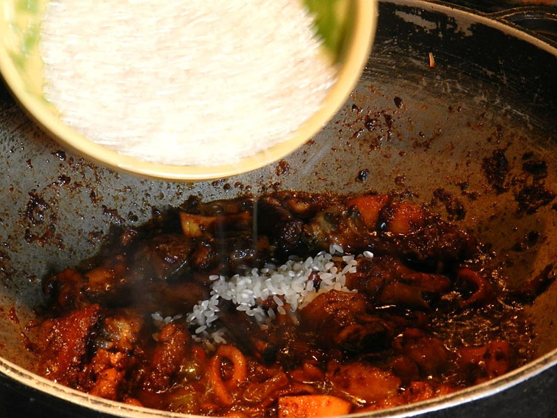 Deixem reduir l’aigua de la cassola i ja podem abocar-hi l’arròs i ho remenem a fi de que l’arròs s’amari del sofregit (Foto).