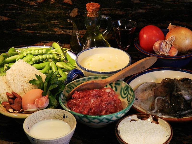 Un cop hem posat la sèpia i les pilotilles a la cassola aprofitarem per fer la picada. En el morter picarem primer el gra d’all i les ametlles i avellanes, quan tot sigui una pasta fina afegireu el julivert picat i la llesca de pa que tindreu fregida fins que quedi tot ben desfet, finalment afegiu la salsa de la sèpia i la copeta de vi ranci i ho remeneu fins que quedi tot integrat. Si feu servir la salsa (hepatopàncrees) de una sèpia grossa, no li poseu tota, doncs el gust final podria quedar inclús massa pujat. Per una cassola de quatre persones amb una cullerada sopera de la salsa de la sèpia n’hi hauria prou. La picada ens aportarà gust i untuositat a la salsa de les mandonguilles i espesseirà el brou. Opcionalment podeu posar-hi una presa de xocolata negre a la picada. Si no teniu morter podeu fer la picada amb una batedora. La picada l’hauríem d’abocar a la cassola uns quatre o cinc minuts abans de tancar el foc una mica després dels pèsols (Foto).
