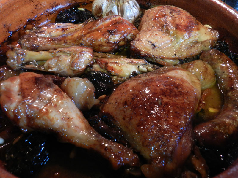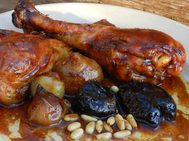 El temps que necessitar` tot plegat dependrà de l’animal, de la seva tendresa i edat, de la mida dels trossos, de la cassola i de la intensitat del foc. A foc més suau, més temps. Pel nostre gust la carn ha de quedar ben cuita i tendra, i finalment s’haurà de desprendre fàcilment de l’os. Si el pollastre és de pagès, requerirà un mínim de dues hores, tal vegada tres o inclús més. És difícil de cronometrar, ho veurem sobre la marxa. A mitja cocció podeu afegir les prunes que teníem en remull i els pinyons. Aneu mullant tot sovint amb una cullera les peces de carn per sobre amb el seu propi suc, com si les volguéssiu lacar.