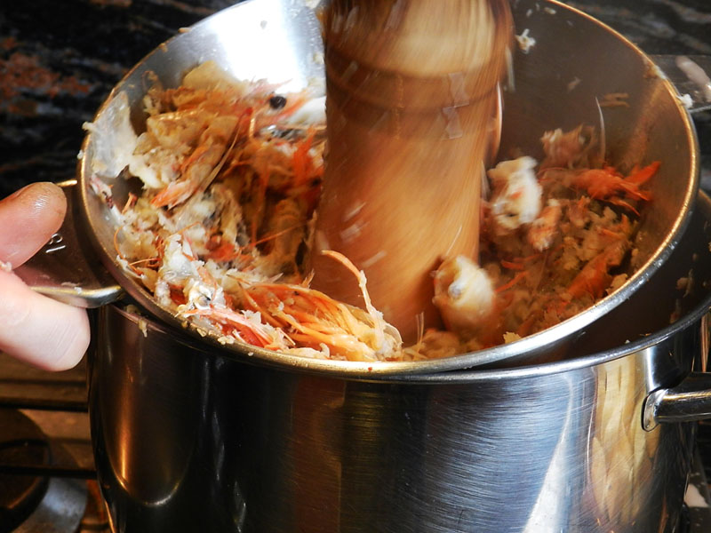 En una olla grossa hi aboqueu un raig generós d’oli i quan sigui ben calent hi aboqueu tots els caps, cues i espines. Guardeu el fetge per després. Aneu remenant la cassola uns cinc minuts a foc fort perquè aquests trossos no s’enganxin massa al cul de la cassola. Es tracta de torrar aquestes parts per tal de que el fumet que farem quedi més intens (reacció de Maillard). Aquests torrats es dissoldran a l’aigua del fumet.