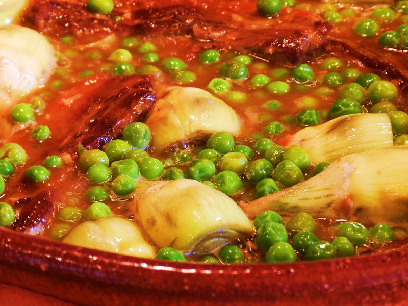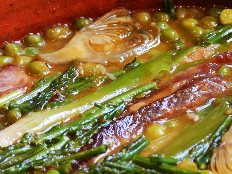 En aquesta recepta aprofitem les darreres i delicioses verdures de l’hivern i les primeres de primavera com són les carxofes, els pèsols i espàrrecs. Podríem incorporar-ne d’altres com cebes tendres, espinacs... Tan sols hi fem un petit, senzill i modest però efectiu sofregit, amb una dent d’all i una tomata. Una manera diferent i molt més saborosa de menjar verdures. Podríem fer aquesta mateixa cassola sense carn, només amb els vegetals. Aquí la fem amb xulles de cansalada, que si volem també les podem substituir per trossos de conill, costelló de porc, pollastre, etc...