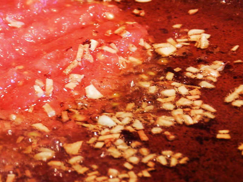 Un cop ben rosses, les reserveu, i en la mateixa cassola comenceu a fer un sofregit amb un gra d’all ben piconat. Quan es comenci a daurar hi afegiu la tomata ratllada, i l’aneu confitant a foc fluix (Foto A - Foto B).