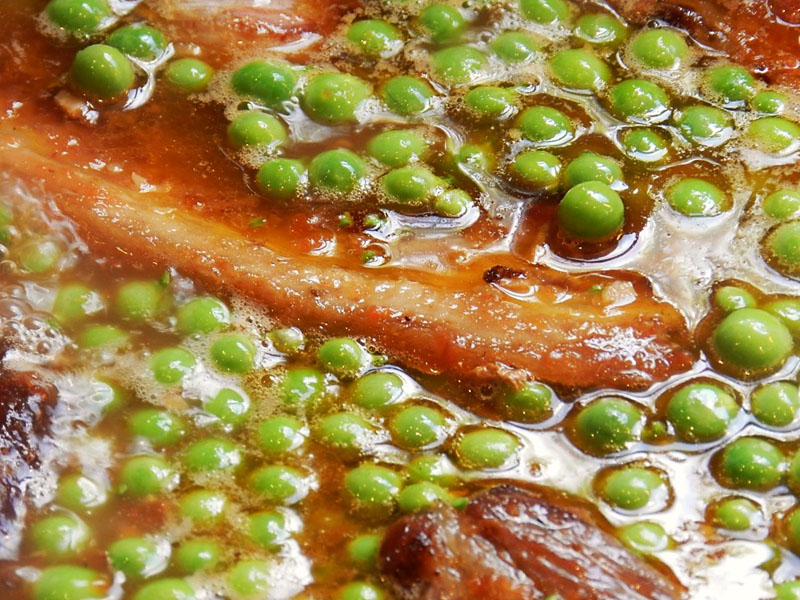Veureu que el brou de la cassola es va reduint. Primer afegim els pèsols a la cassola i quan torni a arrencar el bull afegim els trossos de carxofes i els alls tendres. (Foto A - Foto B - Foto C)