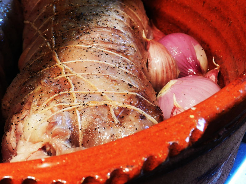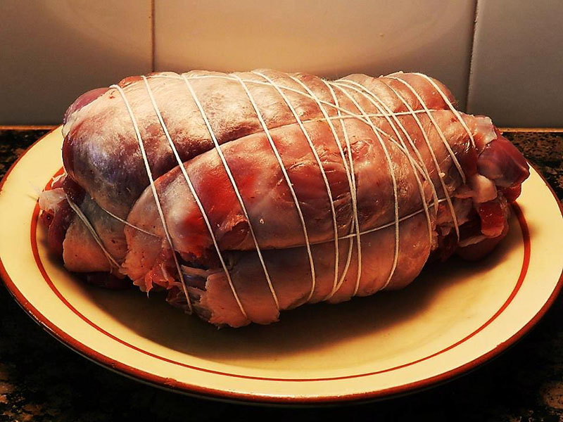 El procés de rostir la carn és el mateix que si no estigués desossada. Millor demaneu al carnisser que us la desossi i us la farceixi amb cansalada o botifarra o el farciment que volgueu. Ell mateix us la lligarà amb fil d’empalomar. Un cop rostida la carn cal deixar-la refredar i desar-la a la nevera per facilitar després el tall. Un cop fetes les rodelles les incorporem de nou a la cassola amb el seu suc. (Foto A - Foto B)