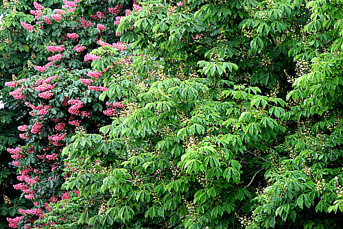 ![]() Inflorescència de l'híbrid Aesculus carnea a la Plaça de Sant Domènec ![]() Inflorescència de l'híbrid Aesculus Hippocastanum a la Plaça de Sant Domènec ![]() |