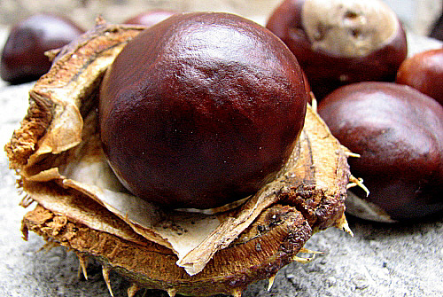 Castanyer d'Índies (Aesculus)![]() El fruit és una càpsula, la castanya, que s'obre en dues o tres parts per alliberar les llavors que conté a l'interior, generalment una i a vegades dues. La coberta d'aquests fruits, espinosa, varia d'una coloració verde a marró, segons les especies. Les llavors, d'entre 4 i 8 cm, presenten una coberta de color entre marró clar brillant a marró fosc amb una notable marca clara o blanquinosa a la base. ![]() El castanyer d'Indies, malgrat el seu nom, és originari de la zona dels Balcans, Grècia, Albània, Bulgaria. Es diu que Clusio, el 1576, va comprar-ne llavor a Constantinoble, i les va sembrar a Viena des d'on es va distribuir a la resta d'Europa. El nom en anglès de l'arbre, horse chestnut, castanyer de cavall, respon exactament a la denominació cientifica Hippocastanum; alguns autors consideren que el nom deu provenir del fet que, en algunes èpoques, es devia emprar com ferratge pels cavalls. ![]() |