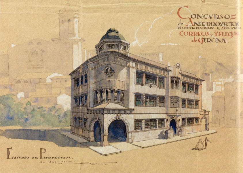 (3) - Les bases del concurs demanaven "conseguir el carácter del edificio, con arreglo a su destino y uso, per medio de bien trazadas fachadas en las que campeen, a ser posible, los estilos históricos nacionales, y, sobre todo, los típicos en la localidad [...] buscando el resurgimiento de Nuestra Arquitectura, procurando la desaparición del exotismo". (Vicenç Fernández, "El edificis de Correus...") Tornar al text