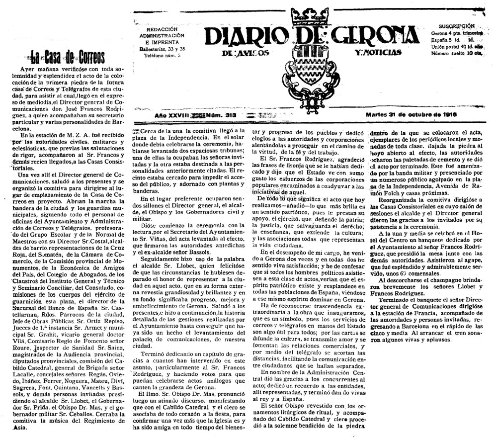 "Y en el acto inaugural de la edificación de la Casa de correos, cuando se reune la selección de la ciudad en una fiesta de paz, presidida por todas las autoridades, honrada por la presencia de las damas, celebrándose un acto donde las personas de más opuestas ideas se imponen mútuo respeto y proceden con exquisita corrección sintiéndose solo ciudadanos y vecinos de Gerona, respirándose en el aire el tranquilo ambiente de la ordenada vida civil, al Gobernador se le ocurre poner frente al público las fuerzas de la benémerita armada con sus maussers, como si amenazara un conflicto pavoroso o fuera inminente el estallido de una turbulenta revuelta", publicava el Diario de Gerona de Avisos y Noticias del 31 d'octubre de 1916.