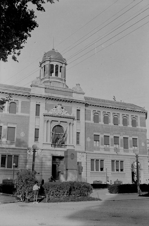 (Ampliar) - Façana de l'edifici de Correus i Telàgrafs, a la Gran Via de Jaume I. Davant l'edifici, el monument a Anselm Clavé. 1934-1940. Salvador Crescenti Miró. CRDI - Ajuntament de Girona.